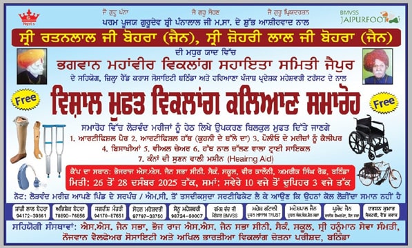Bathinda News: Bathinda ਦੇ ਭੋਜ ਰਾਜ ਜੈਨ ਸਕੂਲ ਵਿੱਚ 26 ਦਿਸੰਬਰ ਤੋਂ 28 ਦਿਸੰਬਰ ਤੱਕ ਮੁਫ਼ਤ ਵਿਸ਼ਾਲ ਦਿਵਿਆਂਗ ਭਲਾਈ ਕੈਂਪ ਲਗਾਇਆ ਜਾ ਰਿਹਾ ਹੈ। ਕੈਂਪ ਦੇ ਆਯੋਜਕ ਸ਼ਾਂਤੀ ਲਾਲ ਬੋਹਰਾ ਨੇ ਦੱਸਿਆ ਕਿ ਇਹ ਕੈਂਪ ਭਗਵਾਨ ਮਹਾਵੀਰ ਵਿਕਲਾਂਗ ਸਹਾਇਤਾ ਸਮਿਤੀ ਜੈਪੁਰ ਅਤੇ ਪੰਜਾਬ-ਹਰਿਆਣਾ ਪ੍ਰਦੇਸ਼ਿਕ ਮਾਹੇਸ਼ਵਰੀ ਟਰੱਸਟ ਦੇ ਸਹਿਯੋਗ ਨਾਲ ਆਯੋਜਿਤ ਕੀਤਾ ਜਾ ਰਿਹਾ ਹੈ। ਇਸ ਕੈਂਪ ਵਿੱਚ ਲੋੜਵੰਦ ਦਿਵਿਆਂਗਾਂ ਨੂੰ ਟਰਾਈਸਾਈਕਲ, ਵ੍ਹੀਲਚੇਅਰ, ਨਕਲੀ ਹੱਥ-ਪੈਰ, ਪੋਲੀਓ ਪੀੜਤਾਂ ਨੂੰ ਕੈਲੀਪਰਜ਼, ਕੰਨ ਸੁਣਨ ਵਾਲੀਆਂ ਮਸ਼ੀਨਾਂ, ਛੜੀਆਂ, ਵਾਕਰ ਆਦਿ ਮੁਫ਼ਤ ਦਿੱਤੇ ਜਾਣਗੇ।